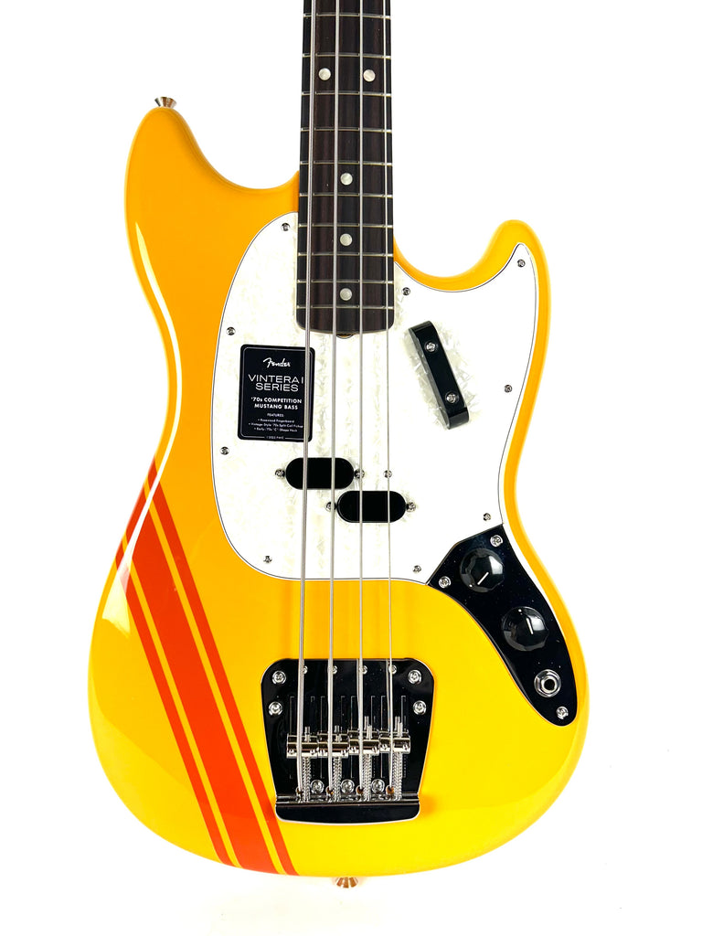 This is an amazing and affordable recreation of the rad '70s competition stripe Mustang Basses. Short scale and super cool Competition Orange finish.